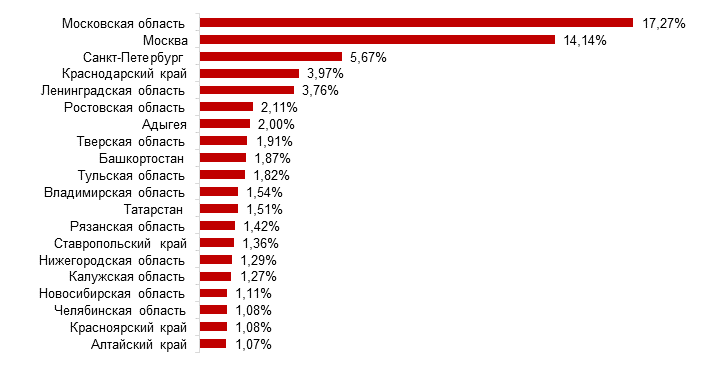 ТОП-20 наиболее популярных туристических регионов России в период с 23 декабря 2019 по 8 января 2020 года