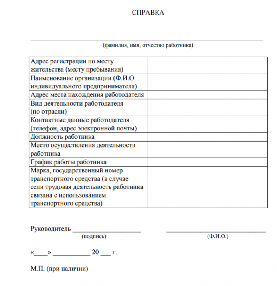Справки-пропуска должны быть оформлены по форме, утвержденной властями. Справка, выданная не по форме считается недействительной. Документ должен быть изготовлен на бланке предприятия и подписан руководителем, либо лицом имеющим право действовать от лица организации.