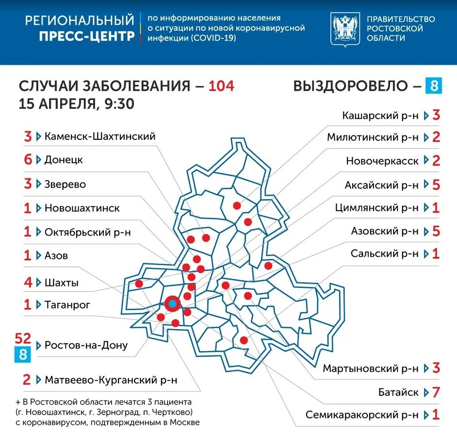 За минувшие сутки в регионе диагноз коронавирус был подтвержден у шести человек. Пятеро – это жители Ростова-на-Дону, еще один – из Шахт. Всего число заболевших в области – 104 человека, из них семь детей, об этом сообщает пресс-служба донского правительства.