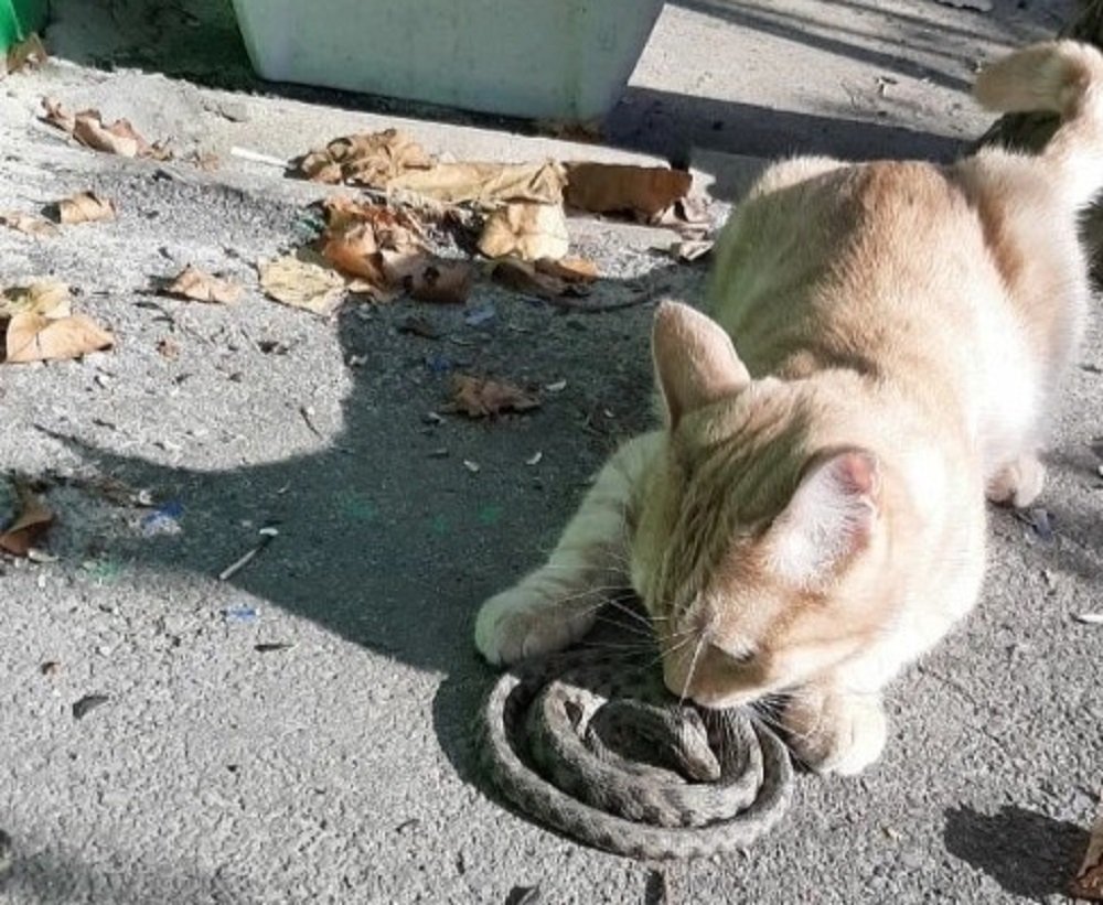 Со слов владельца кот осенью и весной выходит на охоту и возвращается с добычей – змеями. Осенью кот-добытчик принес полумертвую змею, видимо поранил ее в ходе охоты, весной же притащил во двор вполне живую и активную змейку.