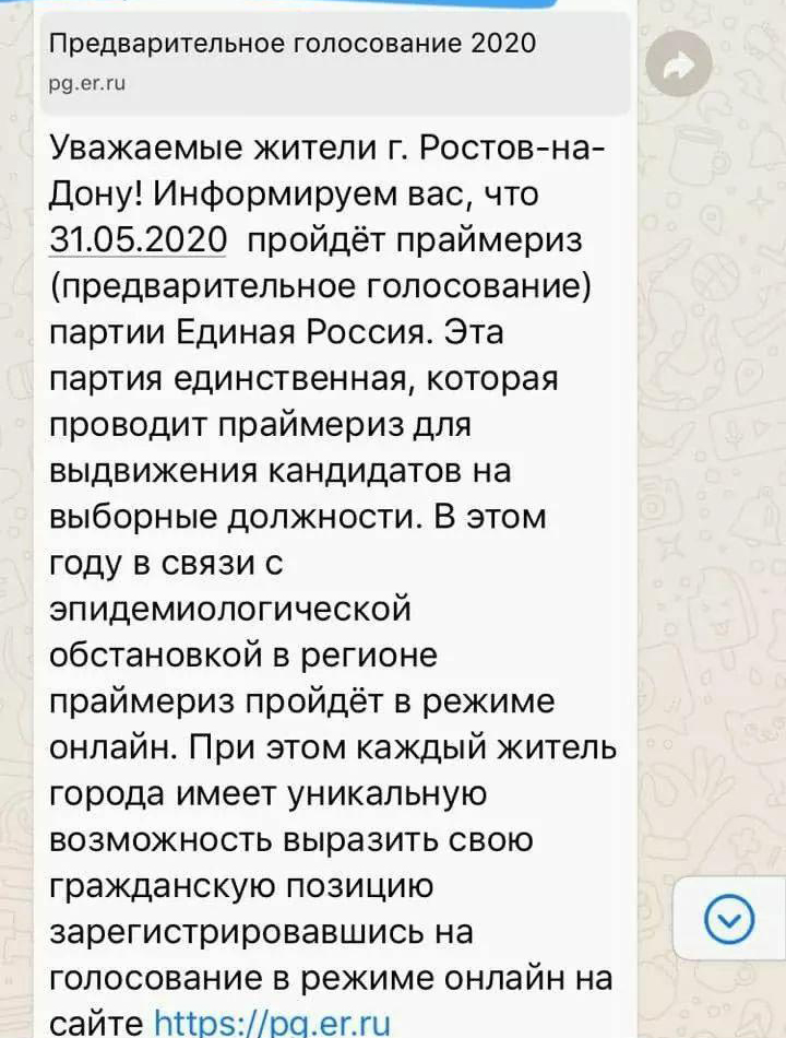 Ростовские единороссы продолжают «кошмарить» учителей, чтобы те повышали явку на предварительном голосовании через родительские чаты, пишет telegram-канал «Ростов-на-кону».
