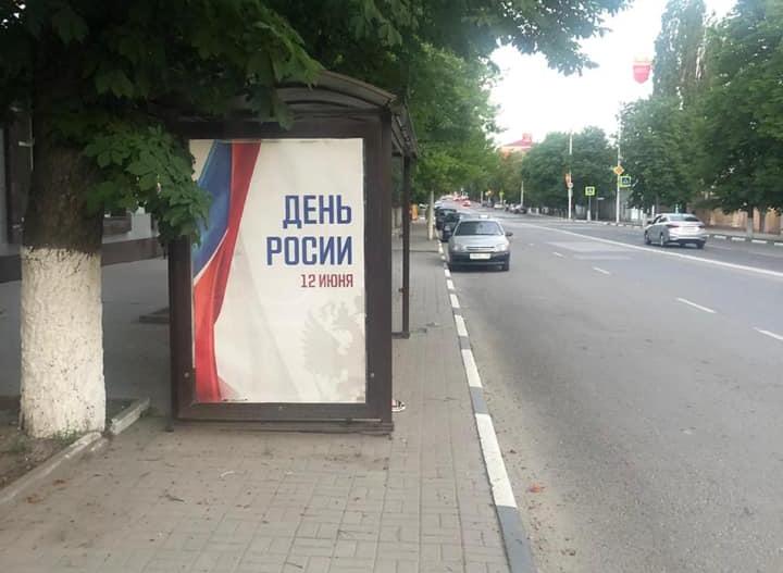 Баннеры были размещены в преддверии Дня России на остановках общественного транспорта.