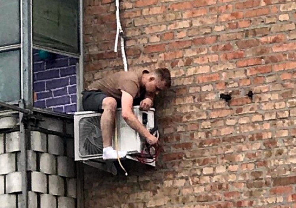 Мужчина сидел на внешнем блоке кондиционера и пытался его отремонтировать.