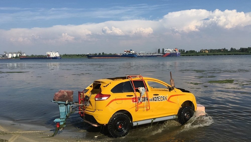Автомобиль оборудовали лодочным мотором и выпустили «в плавание».