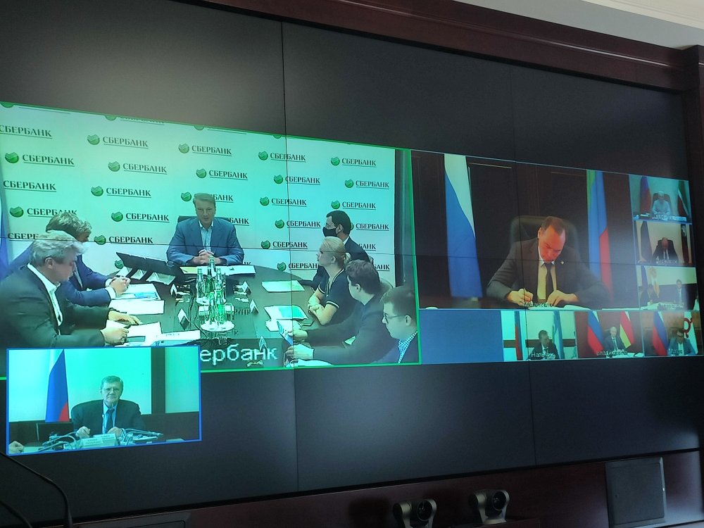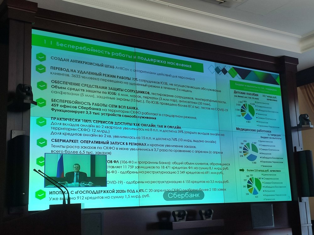 Перед началом совещания Юрий Чайка поблагодарил Германа Грефа и коллектив Сбербанка за помощь и содействие в решении важных для округа задач, связанных с обеспечением стабильности социально-экономической ситуации, в том числе и в период пандемии.