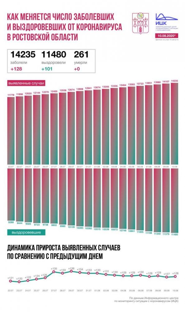 Если вчера было выявлено 127 новых случаев, то сегодня уже 128. С начала пандемии положительный тест на коронавирус получили более 14 100 человек, из них выздоровели чуть более 11 300 человек. От COVID-19 скончались более 260 дончан.