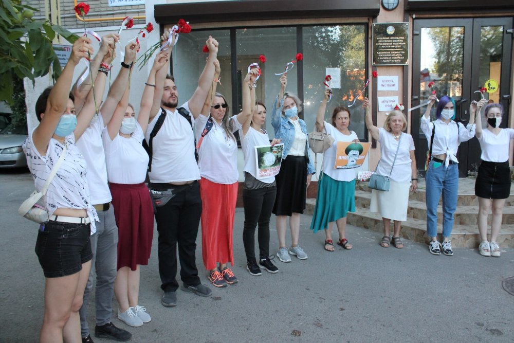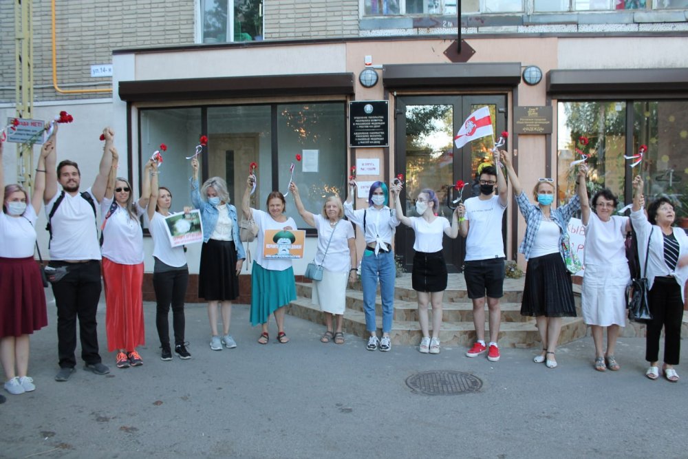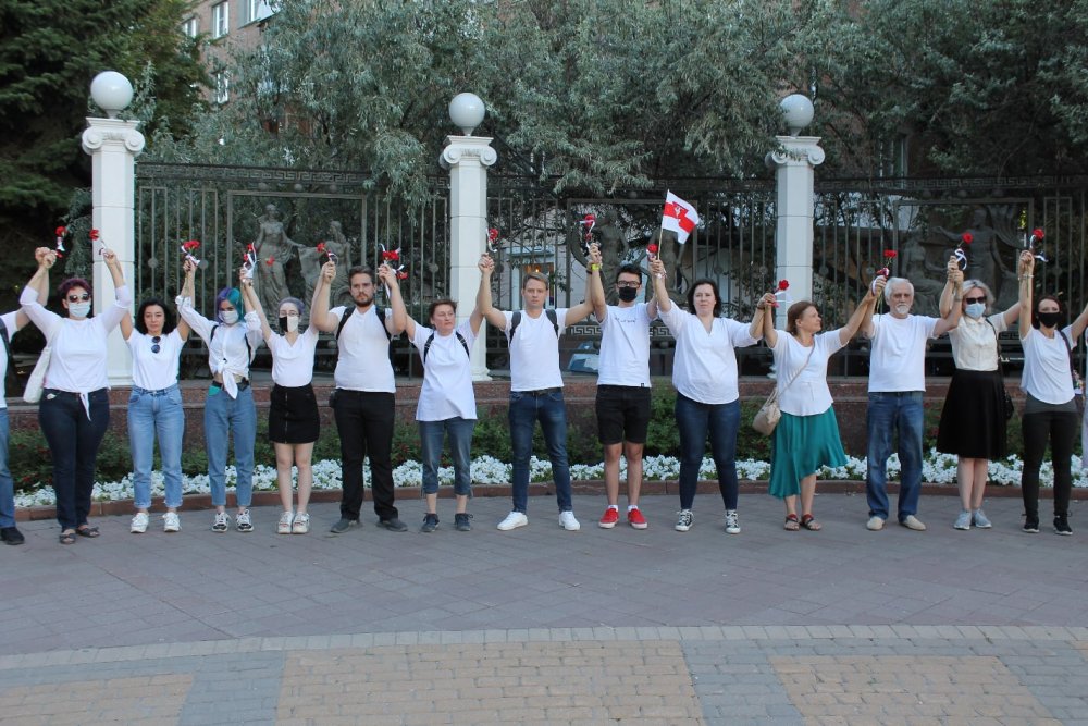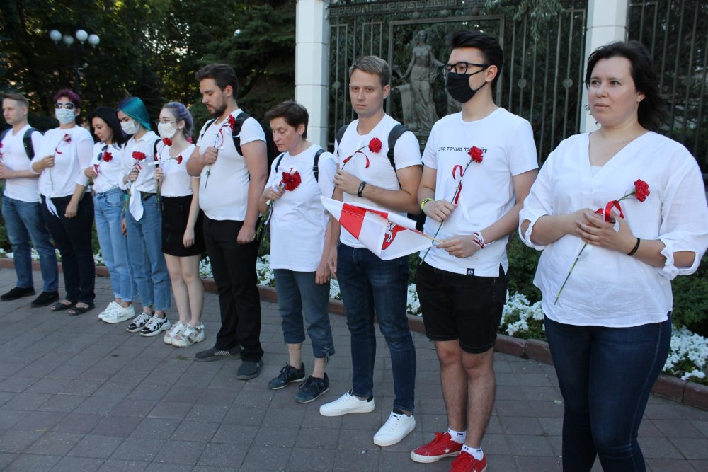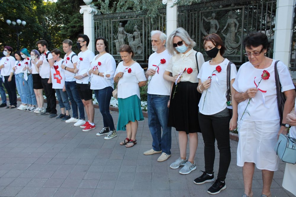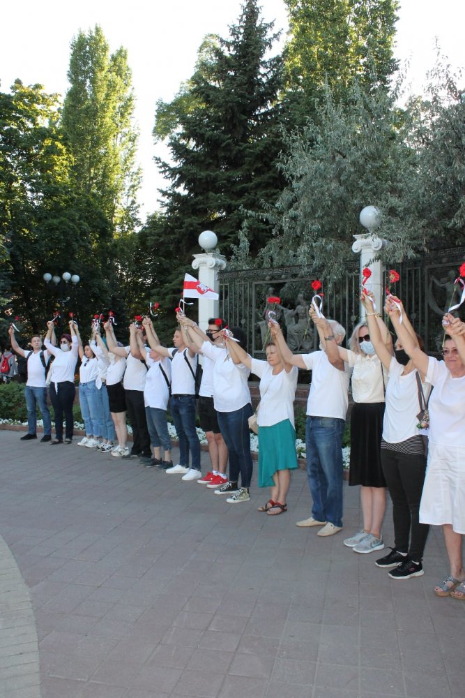 Примечательно, что в цепи стояли люди всех возрастов. Акцию провели дважды – у посольства Белоруссии и чуть позднее на Пушкинской улице, недалеко от парка им. Революции.