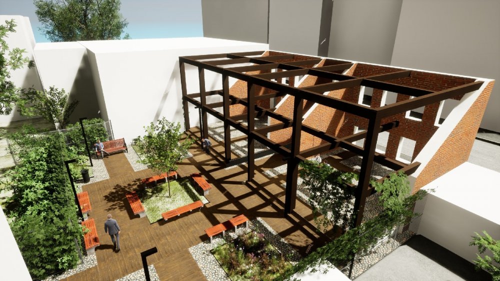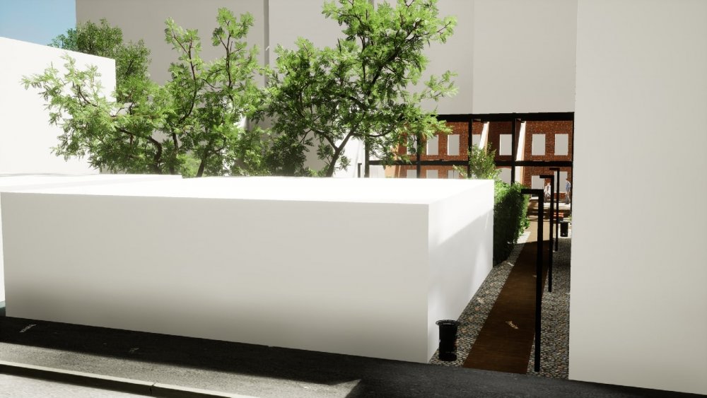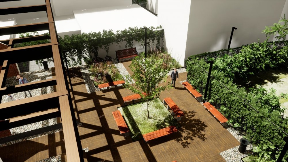 Также по задумке автора предложено разбить небольшой скверик, закрытый от шума и пыли фасадом здания.
