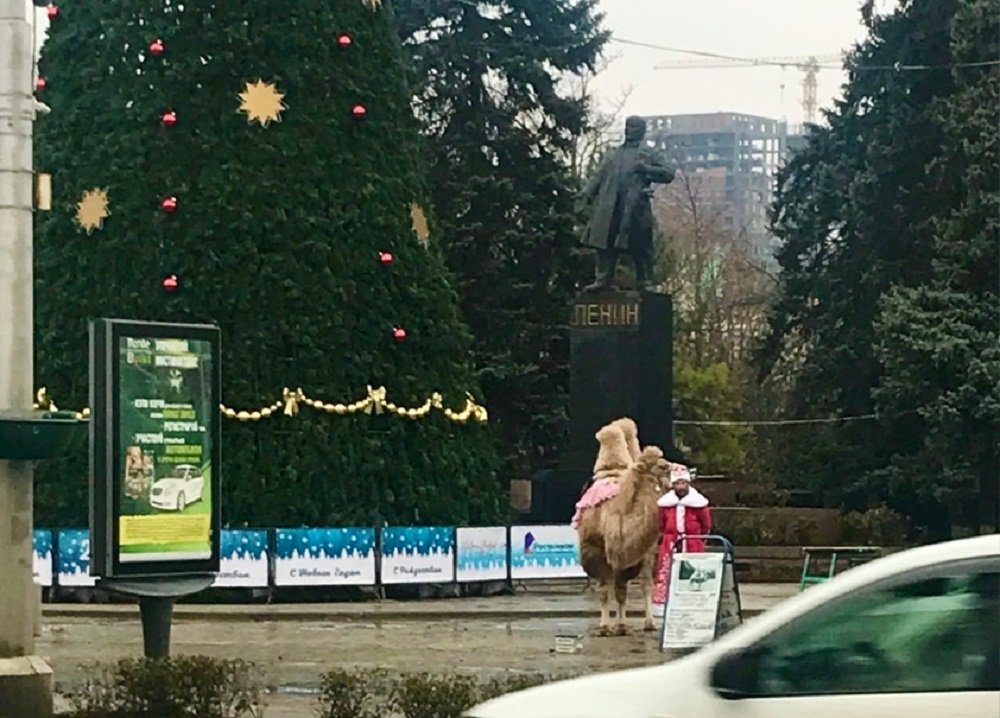 Снимок одинокого Деда Мороза с верблюдом появился сегодня в паблике «Ростов Главный».