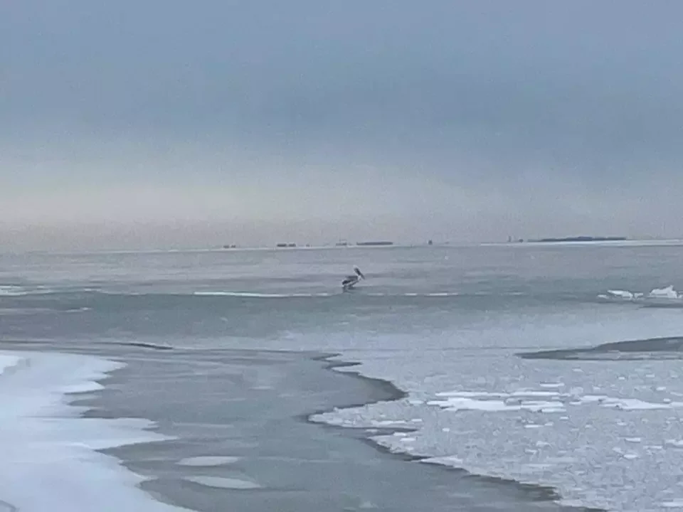 В начале января температура резко снизилась, и второго числа люди обнаружили пеликана, лишенного возможности двигаться. Жители добрались до птицы по льду, аккуратно освободили ее, забрали в дом, согрели и накормили. При осмотре они заметили повреждение крыла, что объяснило беспомощное состояние пернатого и невозможность улететь.
