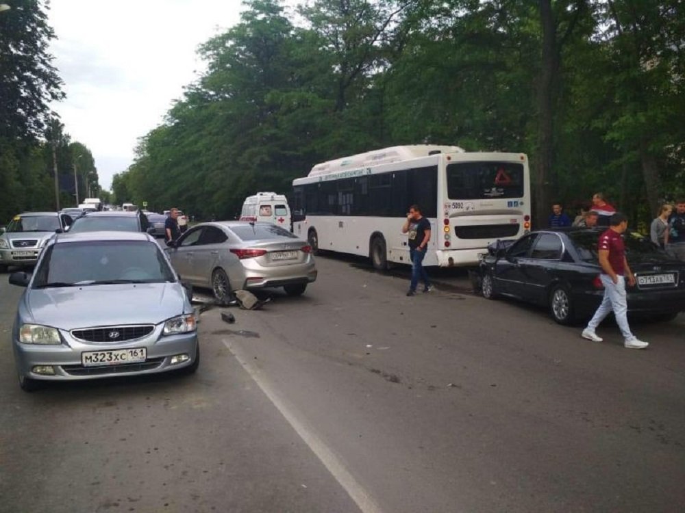 По предварительным данным, водитель Hyundai Solaris, выезжая со двора проигнорировал правила дорожного движения и не пропустил следующий по Еременко Hyundai Sonata. Иномарки столкнулись. От удара одну из них отбросило на автобус, стоящий на остановке. Второй автомобиль выбросило на встречную полосу, где он зацепил Hyundai Accent и Subaru Tribeca, об этом сообщает пресс-служба ГИБДД по Ростовской области.