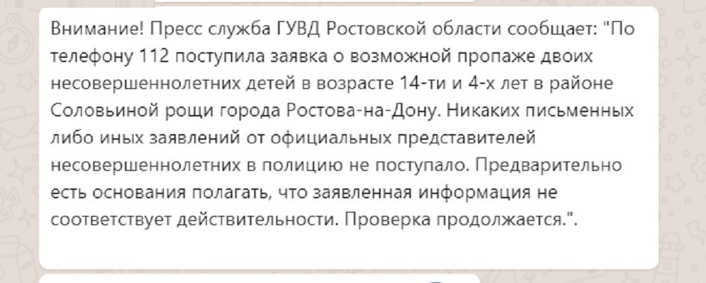 Волонтеры рекомендовали ростовчане прежде чем раздувать панику проверять информацию о пропаже детей на официальных порталах МВД и СК. Информация о пропавших детях публикуется там молниеносно. В случае, если информации там нет, то это повод о том, чтобы подумать, а был ли ребенок?