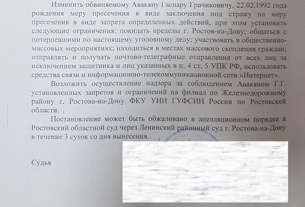 Спустя восемь месяцев суд изменил Гаспару Авакяну меру пресечения. Мужчина выпущен из СИЗО, но ему запрещено выполнять ряд действий, в том числе появляться на массовых мероприятиях, покидать пределы Ростова, общаться с фигурантами дела и обмениваться какой-либо информацией через сеть Интернет и почтово-телеграфные службы.