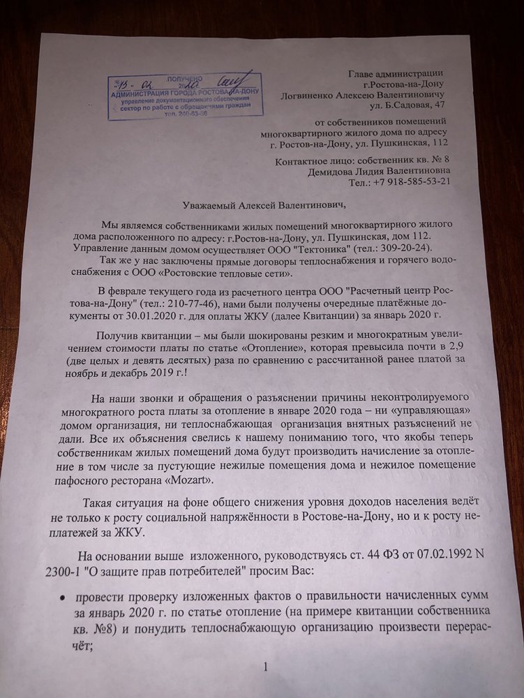 Поскольку нам не дали ясных объяснений - мы обратились к новому сити-менеджеру Ростова с заявлением (прилагается) о проверке сложившейся ситуации, в котором так же указали, что подобные ситуации ведут к росту социальной напряженности и неплатежей за коммунальные услуги».