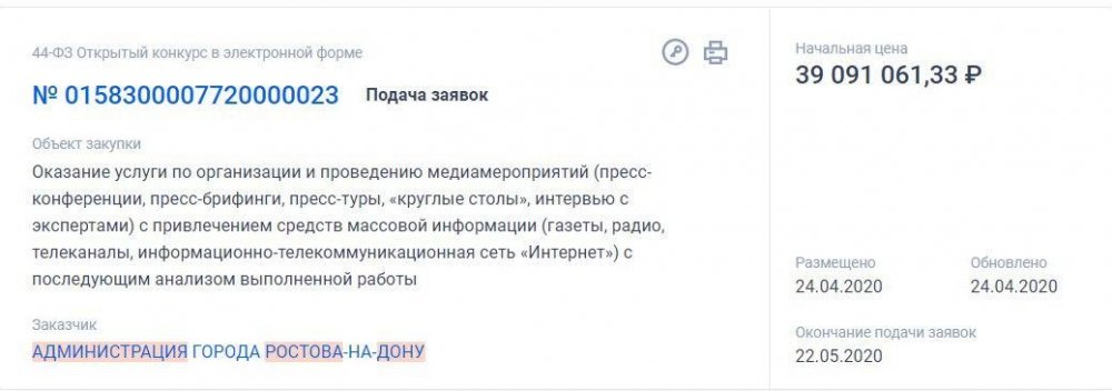 Власти Ростова готовы потратить на свой пиар в СМИ более 39 миллионов рублей, об этом сообщает telegram-канал «Ростов-на-кону».