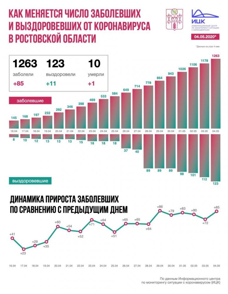 Всего на утро 4 мая на Дону выявлено 1 263 заболевших.