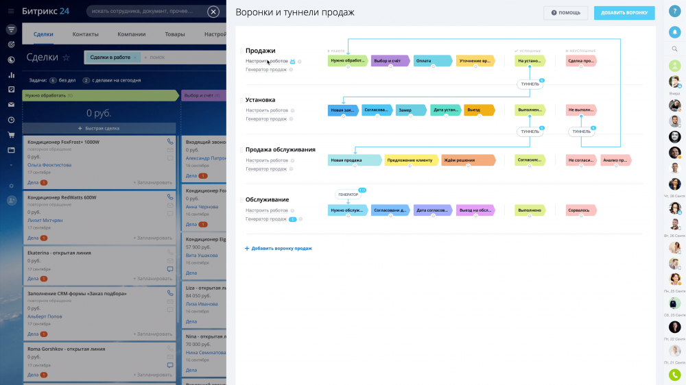 В «Битрикс24» этот инструмент дополнен туннелями продаж. Это значит, что воронку продаж можно настроить между различными стадиями и включить автоматизированный генератор продаж. Для этого нужно обозначить путь покупателя от одной стадии продажи к следующей, а «Битрикс24» выстроит бизнес-процессы по данному сценарию.