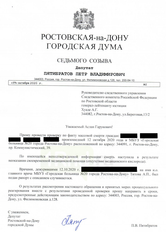Следственный комитет располагает документальной информацией о массовой гибели пациентов в горбольнице №20 Ростова. В официальном запросе, направленном следователям, ростовский депутат Петр Пятибратов обнародовал рапорт врачей об инциденте в больнице 12 октября.