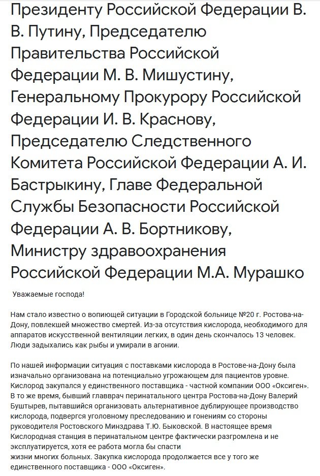 Юрист написала обращение президенту страны Владимиру Путину с требованием отправить в отставку губернатора Голубева и главу донского Минздрава Татьяну Быковскую. По мнению Екатерины Гордон, они скрывают информацию о 13 скончавшихся в горбольнице №20 пациентов.