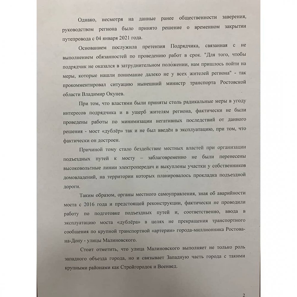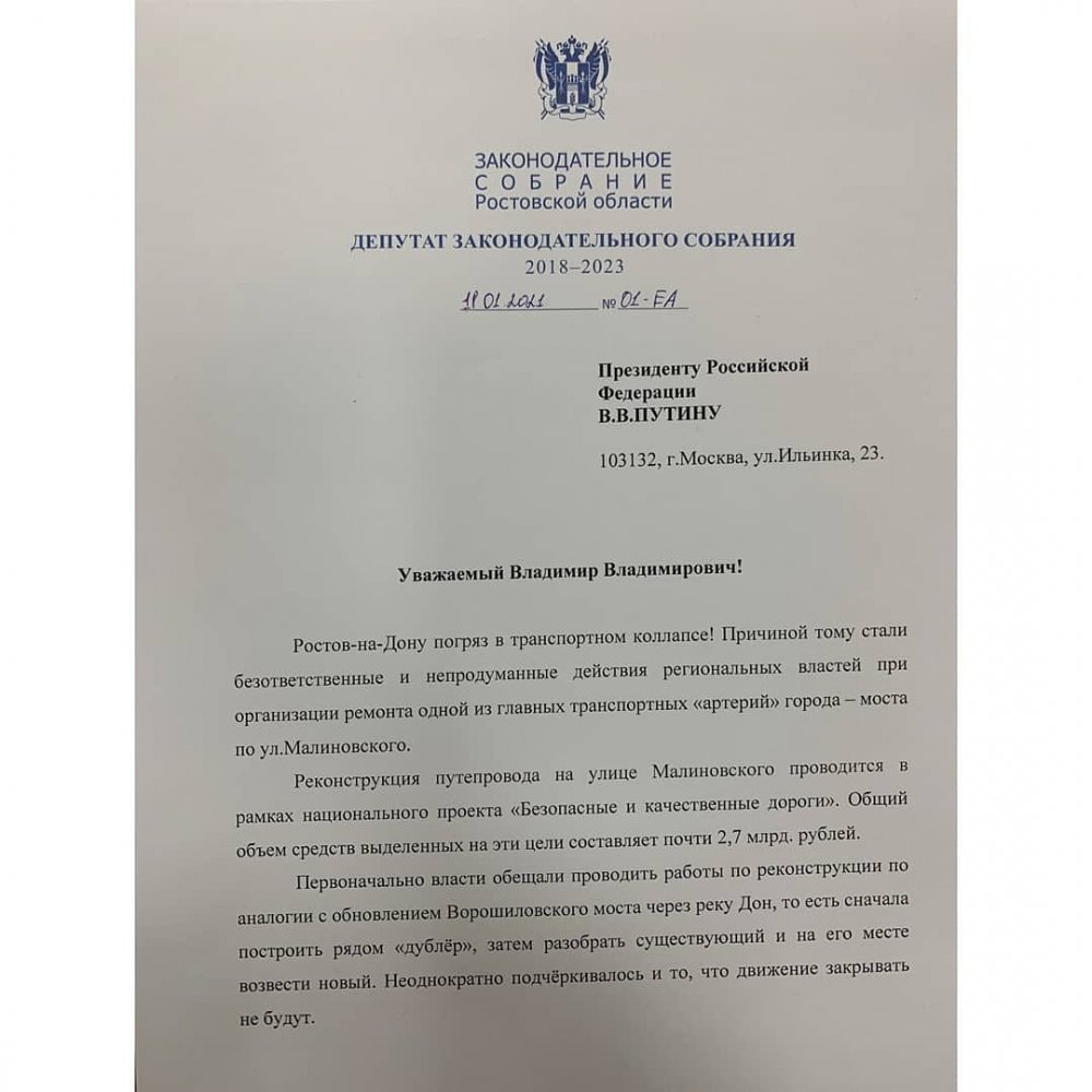 Особый акцент в обращении я сделал на провале ростовских чиновников, которые не смогли создать условия для прокладки дороги к уже построенному мосту-дублёру, из-за чего ростовчане теперь вынуждены объезжать ремонтируемый мост через весь город