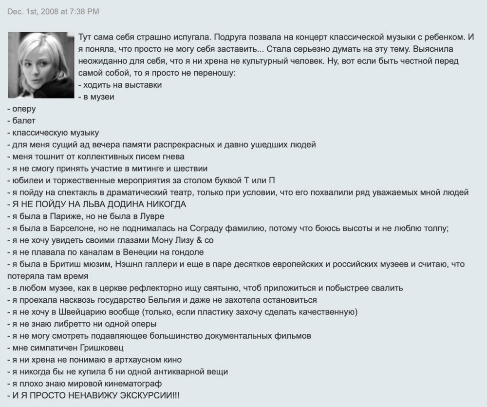 В записи от 1 декабря 2008 года автор блога сообщила подписчикам, что не считает себя культурным человеком. При этом она отметила, что не любит оперу, балет, классическую музыку и музеи, об этом сообщает «Медуза».