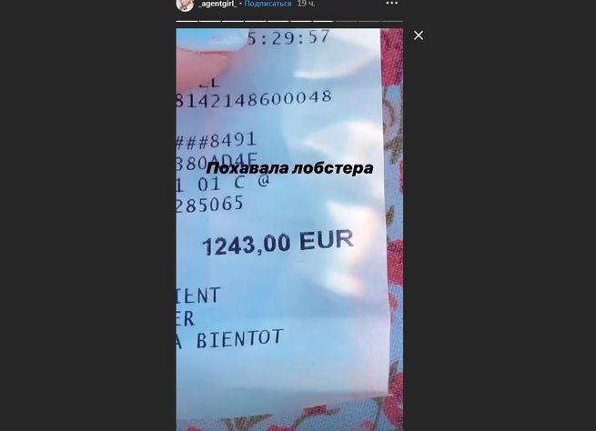 На кадре блогер показывает счет из ресторана, на котором отчетлива видна сумма -1243 евро. Если перевести в рубли по нынешнему курсу то обед супругам обошелся в 88 тысяч рублей.