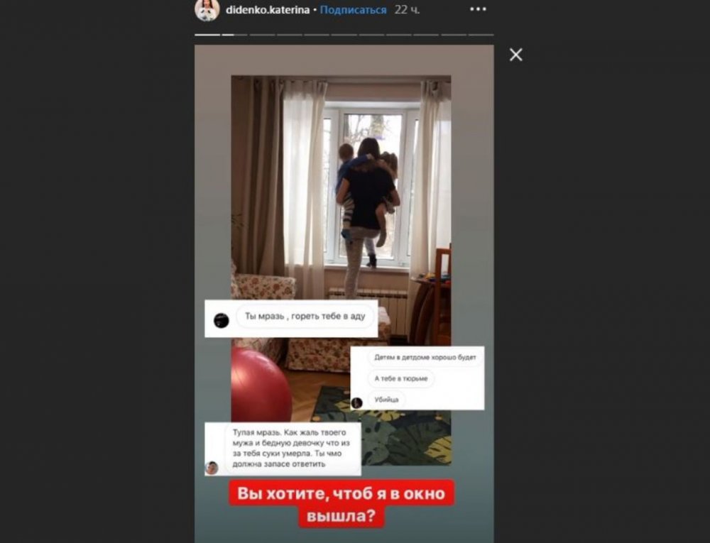 После ЧП Екатерина подверглась травле со стороны подписчиков в Instagram. Блогер долго терпела издевки, но в итоге решила дать отпор хейтерам, но сделала это весьма необычно. В своем сториз она разместила снимок, на котором она запечатлена стоящей на подоконнике. В руках она держит детей