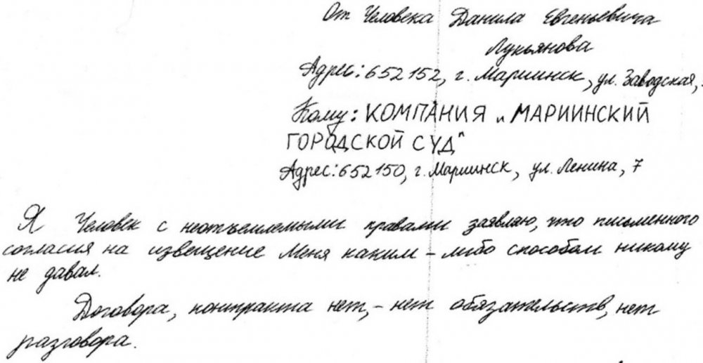 – Я Человек с неотъемлемыми правами заявляю, что письменного согласия на извещение Меня каким-либо способом никому не давал. Договора, контракта нет, – нет обязательств, нет разговора, – говорится в обращении молодого человека.