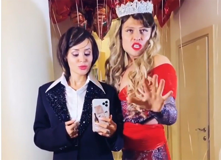 Прохор предстал перед камерой в вечернем платье, с диадемой на голове и ярким макияжем. Его спутница предпочла классический мужской костюм.