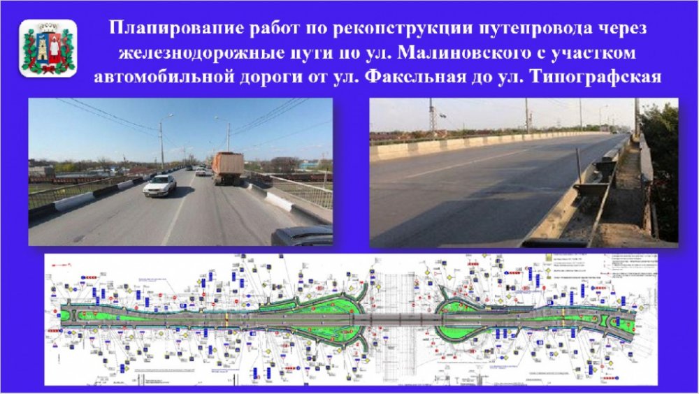 К активной фазе строительства путепровода на улице Малиновского приступили в этом году. Проектной документацией также предусмотрено проведение реконструкции участков автомобильной дороги по Малиновского от ул. Факельная до ул. Типографская, общей протяженностью 1231,1 м. Завершить реконструкцию путепровода планируется до декабря 2021 года.