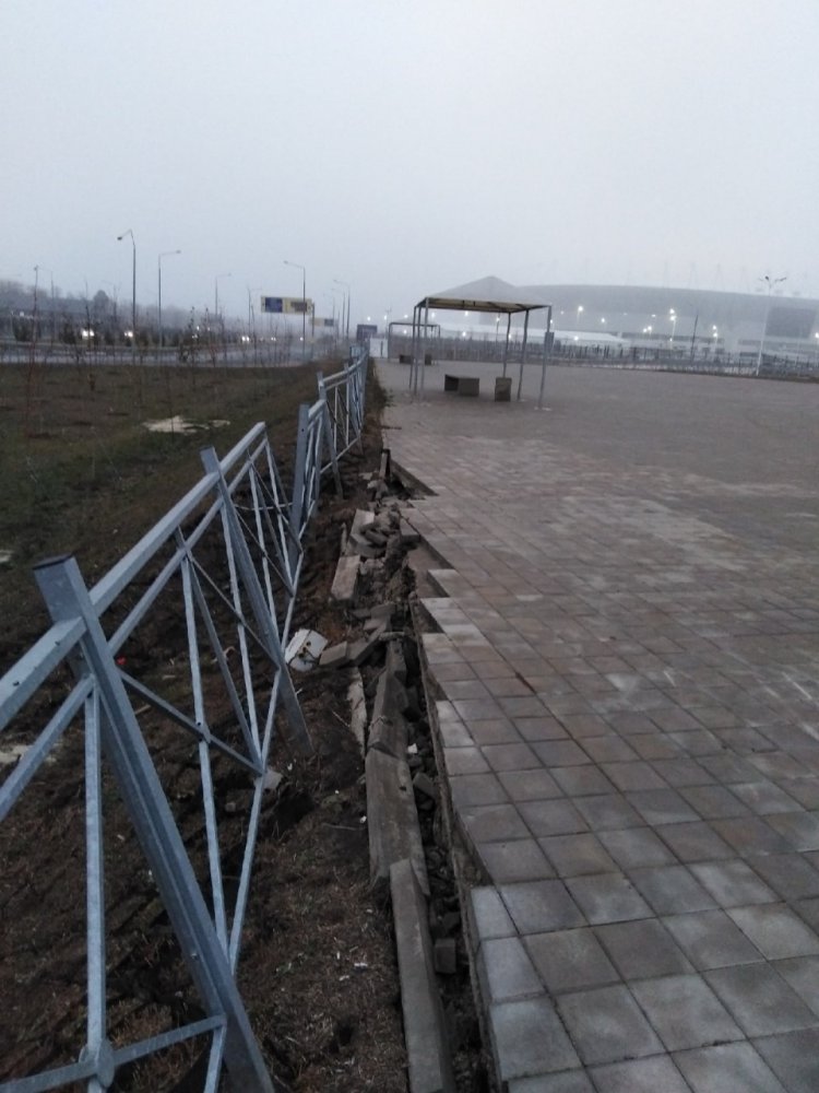 В сети горожане опубликовали ряд снимков, на которых запечатлена полная разруха. Вблизи стадиона развалился забор, местами разрушена плитка, часть которой разрушена, высаженные саженцы деревьев выглядят сухими. Сильный ветер, бушевавший на прошлой неделе, повалил знаки и часть ограды.